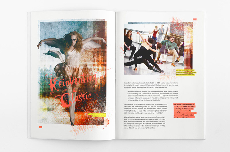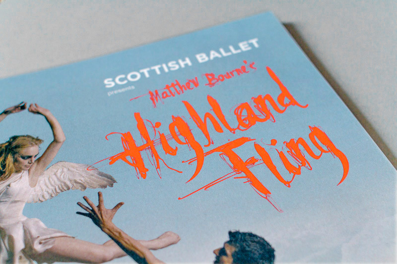 Set in nineties Glasgow, the show has been unofficially dubbed 'Trainspotting: the Ballet'. Accordingly in the programme design I wanted it to be a bit chaotic and a little bit grungey. Tartan is used heavily (somewhat ironically) throughout the production designs and I've incorporated it, as well as graffiti taken from the actual set, in a series of illustrations. I included splashes of neon Pantone to give the whole layout a modern edge.
